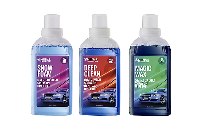- Kit Détergent en 3 étapes spécial nettoyage auto pour nettoyeurs haute pression— mousse de prélavage, shampoing carrosserie et cire lustrante.